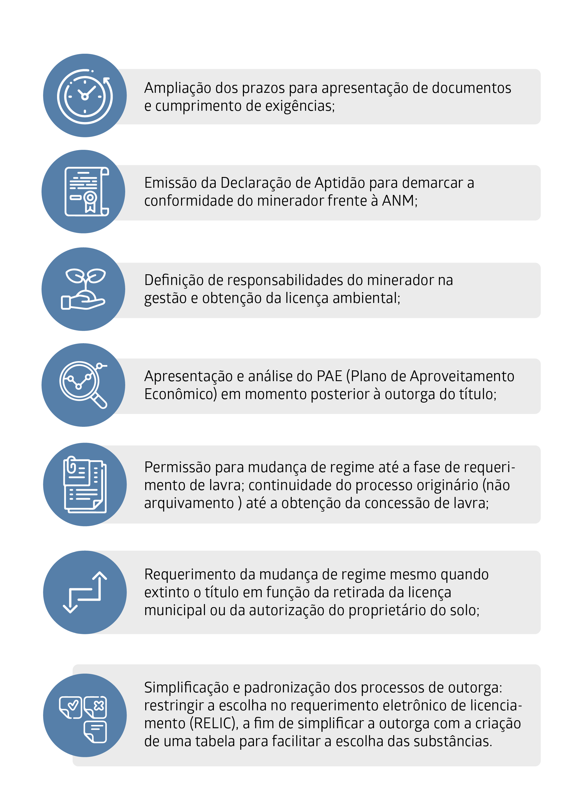 Para agilizar a análise e a concessão de Registros de Licença, a minuta de resolução propõe a criação de um sistema automatizado e integrado com os dados da ANM e de outras instituições. Durante a análise do requerimento, será utilizada uma matriz de risco para avaliar diversos fatores, como o método de lavra, a existência de barragens e pilhas de rejeito, o método de desmonte, o beneficiamento e outros fatores, determinando a necessidade de apresentação do Plano de Aproveitamento Econômico (“PAE”).