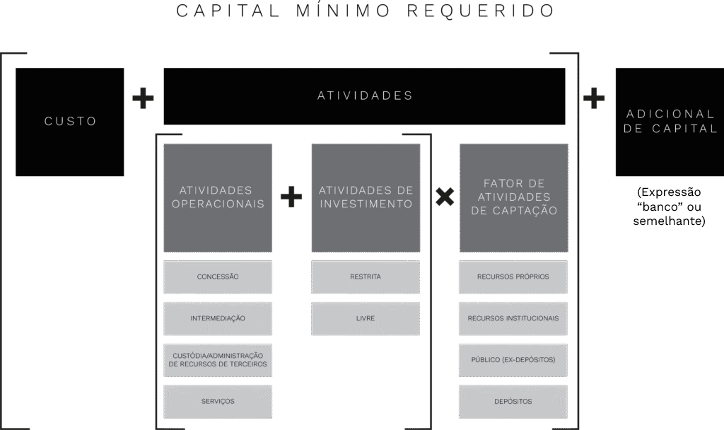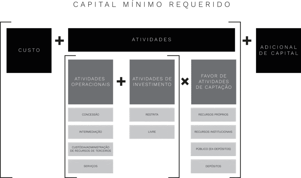 Com as Novas Regras, o limite mínimo exigido de Entidades Obrigadas deixa de ser um valor em reais fixado ex ante conforme o tipo de instituição para se tornar um limite a ser apurado conforme uma metodologia específica que contempla elementos relacionados a custo, atividades operacionais, atividades de investimento e atividades de captação, além de um possível adicional de capital.