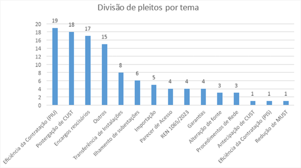 Confira a classificação temática de pleitos apresentados e analisados pela Coordenação de Acesso ao Sistema de Transmissão da Superintendência de Regulação dos Serviços de Transmissão e Distribuição de Energia Elétrica (“STD”) entre 2023 e novembro de 2025: