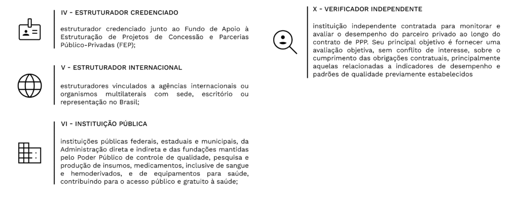 Os Projetos de Investimento deverão fazer parte do escopo de um contrato de concessão, permissão, autorização ou arrendamento nos subsetores prioritários do setor de saúde pública e gratuita e só poderão abranger ações de implantação, ampliação, adequação ou modernização de bens de capital.