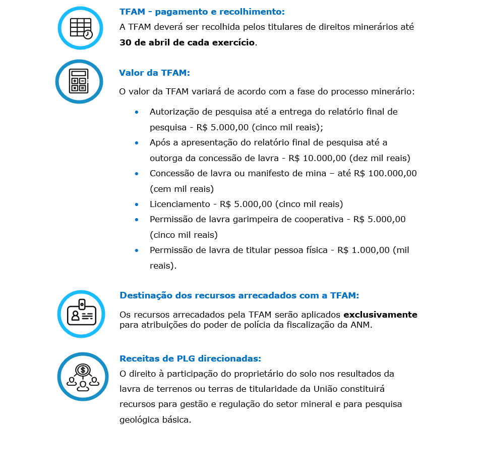 O art. 39, por sua vez, institui a Taxa de Fiscalização de Atividades Minerais. Nesse contexto, a referida taxa será devida pelos titulares de direitos minerários sob os regimes legais de autorização de pesquisa, de concessão de lavra e de permissão de lavra garimpeira.